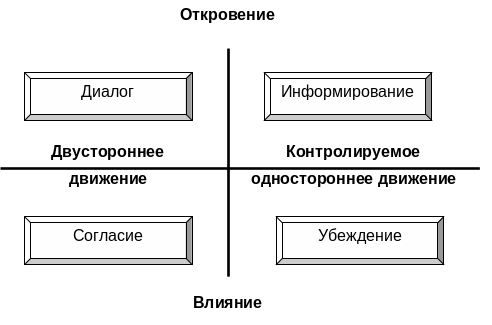 Квадрат «двустороннее движение» — «влияние» определяет стратегию достижения согласия. Ее суть состоит в стремлении к координации отношений между организацией и окружающей средой или работниками. Эту стратегию чаще всего применяют для разрешения конфликта интересов, и она предполагает процесс взаимного влияния. Она наиболее эффективна в условиях реализации инновационной политики и при наличии активной общественности.