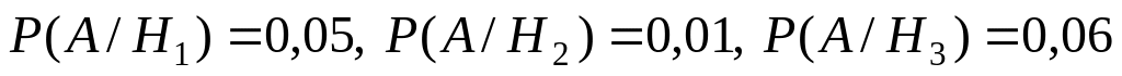Партия содержит 20% деталей, изготовленных заводом I, 30% – заводом II, 50% –заводом III. Для завода I вероятность выпуска бракованной детали равна 0,05, для завода II – 0,01, для завода III – 0,06. Чему равна вероятности того, что наудачу взятая из партии деталь окажется бракованной (событие A)?