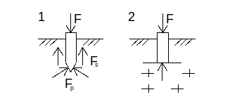 Со всех сторон окружены сжимаемыми грунтами, под нагрузкой такие сваи получаю осадку и по их боковым поверхностям развивается сила трения Fs. Под нижним концом сваи возникает сопротивление грунта Fp. Несущая способность таких грунтов будет равна: Fd=Fp+Fs