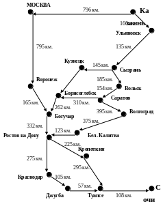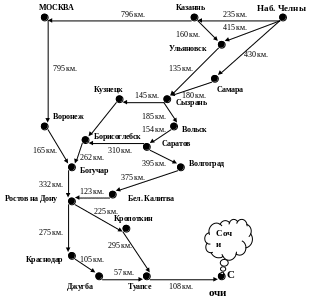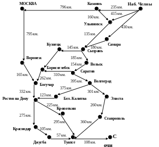 Автолюбитель планирует ехать отдыхать в г. Сочи из г. Казани. Прямого сообщения между городами нет. Добраться до Сочи можно различными путями, расстояния проезда между каждой парой промежуточных пунктов указаны на схеме.