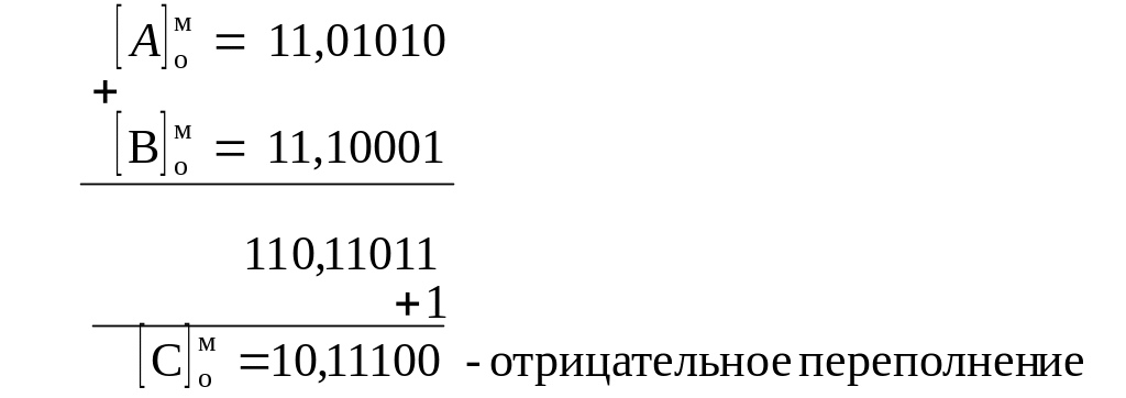 В обратном коде переполнение разрядной сетки возможно при неправильном выборе масштабных коэффициентов в первом и в четвертом случаях. Признаком переполнения, как и в других кодах, является отличие знака результата от знаков слагаемых
