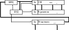 Для реализации второго варианта (рис. 4.13) необходимы: n-разрядный регистр делителя; (n+1)-разрядный регистр частного со сдвигом влево; п- или (п + 1)-разрядный сумматор со сдвигом влево и схема управления. Сумматор производит сдвиг текущего остатка влево и алгебраическое "сложение его с делителем. Передача в СМ модуля делителя или его дополнения обеспечивается БУД, который анализирует сдвигаемые из СМ знаковые цифры остатков. Эти же цифры инвертируются в БИЦ и подаются в младший разряд Рг частного как цифры частного.