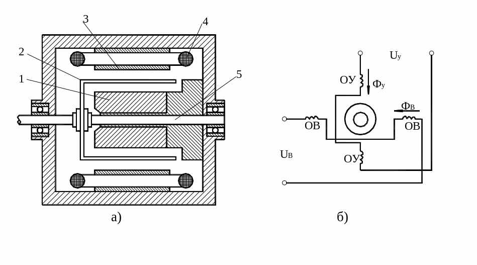 В качестве примера на рисунке 9а, приведена конструкция электродвигателя с полым немагнитным ротором. Ротор 2, выполненный из немагнитного материалу, закреплен на валу 5 двигателя. В полости ротора расположен внутренний статор 1, служащий для увеличения магнитной проницаемости на пути замыкания магнитного потока. При отсутствии внутреннего статора значительно увеличивается путь магнитного потока и воздушном пространстве полости ротора, что приводит к уменьшению магнитного потока и КПД двигателя*. Применение внутреннего статора позволяет уменьшить общий воздушный зазор между цилиндром ротора и внешним и внутренним статорами до 0,6—1,0 мм. Это обусловливает увеличение КПД двигателя и относительное уменьшение габаритов. В двухфазных асинхронных электродвигателях часто статор с обмотками располагают внутри ротора двигателя. В пазы внешнего статора 3 закладываются две обмотки 4 таким образом, чтобы магнитные оси их были взаимно перпендикулярны (рисунок 9,б). Одна из обмоток статора является возбуждающей 0В и подключается к источнику питания переменного тока с напряжением постоянной амплитуды UВ. Вторая обмотка является управляющей ОУ и обычно питается напряжением переменного тока Uу той же частоты, что и возбуждающая обмотка 05, но сдвинутым по фазе относительно напряжения UB на 90°.