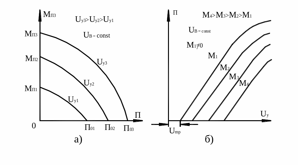 Механической характеристикой называется зависимость вращающего момента М от частоты вращения п ротора при постоянных напряжениях возбуждении UB u управления Uy.