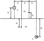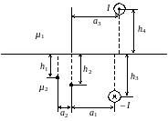 4. Паралельно до безмежної площини розділення двох феромагнітних середовищ з магнітними проникностями μ1 = 1,4 μ0 та μ2 = 2,1 μ0 й паралельно один до одного розміщенні два довгі тонкі ізольовані провідники, що утворюють двопровідну лінію. По лінії тече постійний струм І = 3,7 А в напрямку, який вказаний на рисунку. Біля лінії знаходиться виток, який виготовлений також із тонкого ізольованого провідника і має вид прямокутної рамки. Дві сторони цього прямокутного витка паралельні до провідників лінії. Розмір витка у напрямку, який перпендикулярний до площини рисунка дорівнює 46 мм. (20 балів).