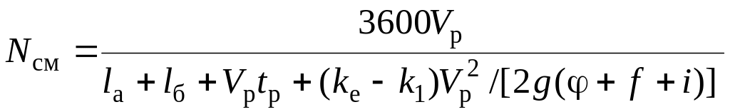 де kn - коефіцієнт ефективності використання смуг руху транспортом, величину якого приймають для однієї смуги руху за 1.0 (за відсутності на перегоні зупинок громадського транспорту або якщо їх влаштовано за межами проїжджої частини), для двох – 1.9, для трьох – 2.7, для чотирьох – 3.5.