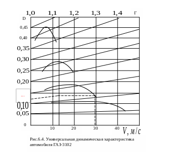 Так как динамический фактор автомобиля при одинаковых прочих параметрах изменяется обратно пропорционально его весу, то масштабы динамического фактора на характеристике должны быть разными для каждого значения коэффициента нагрузки автомобиля. Соединяем наклонными прямыми одинаковые значения динамического фактора для различных вариантов нагрузки автомобиля. Таким образом, универсальная динамическая характеристика автомобиля ГАЗ-3102 построена и представлена на рисунке 6.4.