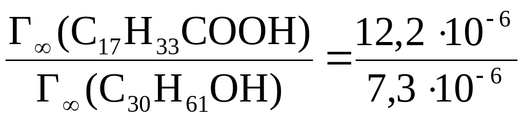 Пример 4. 5. Во сколько раз величина предельной адсорбции олеиновой кислоты С17Н33СООН (плотность 0,84 103 кг/м3) больше предельной адсорбции мирицилового спирта С30Н61ОН (плотность 0,78 103 кг/м3) при одинаковой толщине адсорбционного слоя обоих ПАВ, равной 4,1 нм.