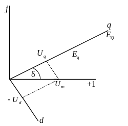 Нумерация слева в формулах (2.30)–(2.32) соответствует принятой для исходной системы уравнений движения (2.22). На рис. 2.7 показаны проекции вектора напряжения, совмещенного с синхронно вращающейся действительной осью (+1) на оси q и d.