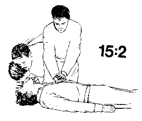 осуществляют 15 сдавлений грудины с частотой 80-100 в 1 мин. После 15 сдавлений производят два раздувания легких и продолжают чередовать 15 надавливаний на грудину с двумя раздуваниями легких;