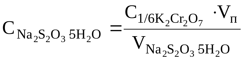 Расчет результатов анализа. При выполнении анализа методом отдельных навесок молярную концентрацию эквивалента раствора тиосульфата натрия рассчитывают по формуле: