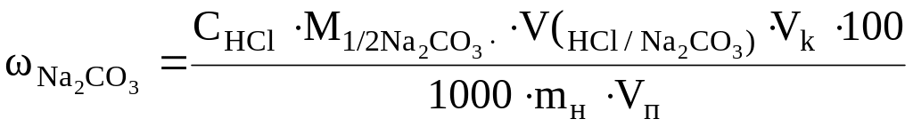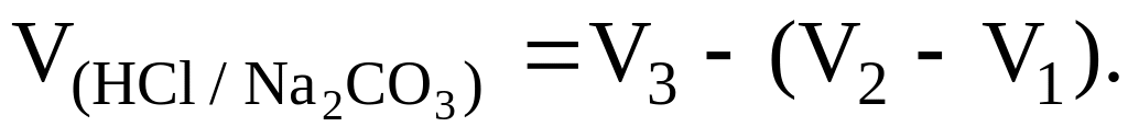 Для определения объема кислоты, соответствующего общей концентрации компонентов, титруют аликвотную часть раствора смеси в присутствии метилоранжа (V3). По разности объемов HCl, пошедших на титрование всей смеси и отдельно гидрокарбоната, определяют объем HCl, соответствующий концентрации Na2CO3: