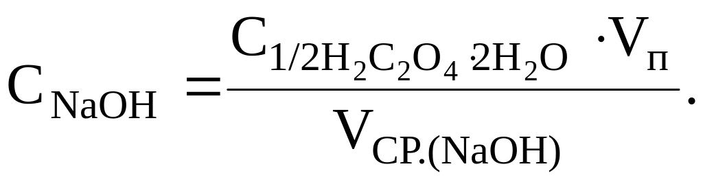 Для титрования отбирают аликвотную часть титрованного раствора кислоты пипеткой, переносят в коническую колбу для титрования, прибавляют 1–2 капли фенолфталеина и титруют раствором щелочи до появления слабо-розовой окраски, не исчезающей в течение 30 с. Записывают объем щелочи, пошедший на титрование. Из полученных результатов вычисляют среднее значение объема щелочи, пошедшего на титрование аликвоты щавелевой кислоты. Концентрацию раствора NaOH вычисляют по формуле:
