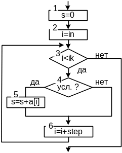 /* с помощью цикла for */ s=0; for(i=in;i<ik;i+=step) if( условие ) s+=a[i]; // или s=s+a[i]; /* с помощью цикла while */ s=0; i=in; while (i<ik) { if( условие ) s+=a[i]; i=i+step; } |