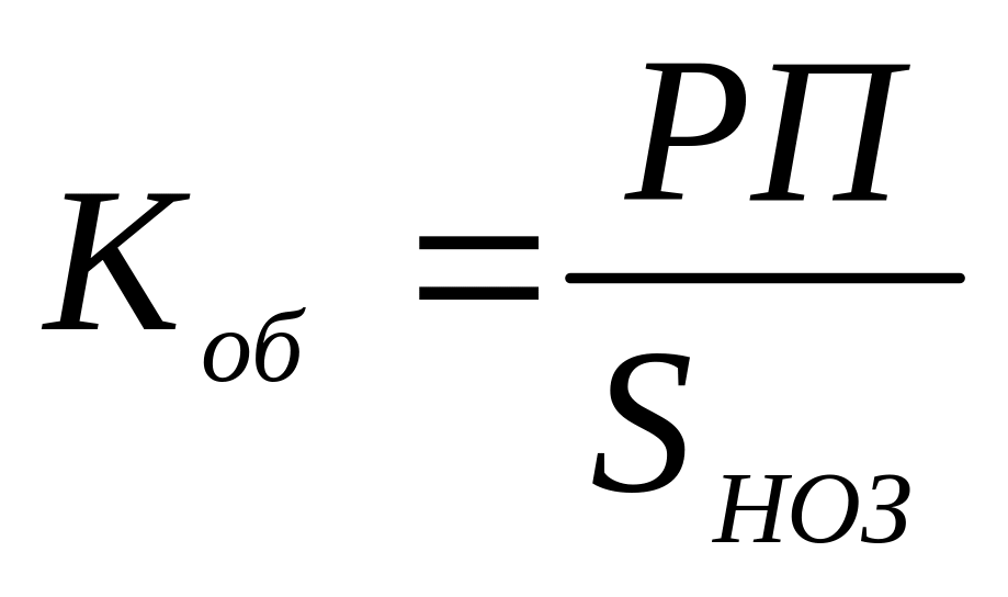 Коефіцієнт оборотності (Кобор) показує кількість оборотів за рік і визначається відношенням реалізованої за рік продукції (РП) до середньорічного залишку нормованих оборотних засобів (Sноз):