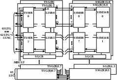 КП SN(B) на 504 LTG состоит из двух плоскостей: 0-ой и 1-ой. Каждая плоскость на ступени временной коммутации содержит восемь коммутационных групп TSG: 0.1 – 0.7 и 1.1 – 1.7. Каждая коммутационная группа содержит по восемь модулей временной коммутации: TSMB0 – TSMB7 и по четыре интерфейсных модуля LISB0 – LISB3. В каждый TSMB включено по 8 линейных групп LTGN, всего 63 LTGN, 0-ой порт используется для подключения к буферу сообщений MBU:LTG. Модули TSMB и LISB соединены друг с другом по перекрестной схеме «kross-over».