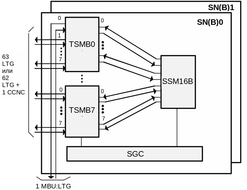 На рисунке 15 приведена структура коммутационного поля SN(B) на 63 LTG. Ступень временной коммутации состоит из восьми модулей TSMB (0 ÷ 7), ступень пространственной коммутации содержит один модуль SSM16B.
