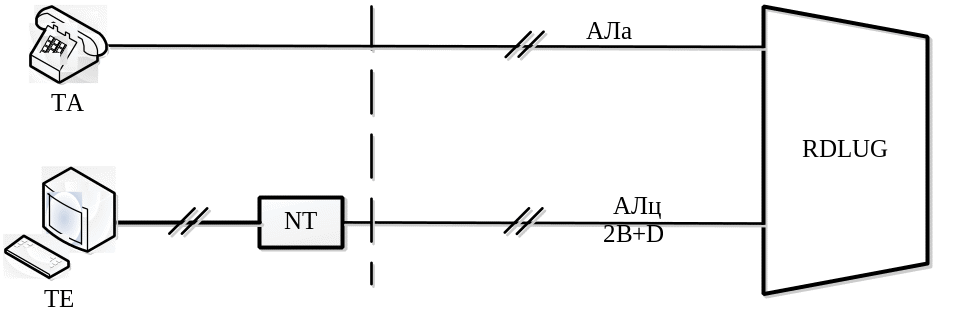 TE – цифровой абонентский терминал ISDN. NT – сетевое окончание ISDN.