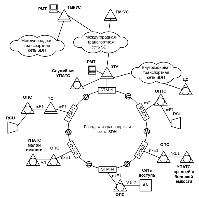 В качестве примера ГСС на рис. 2 показана кольцевая сеть на базе оборудования SDH. Все ОПС и ОПТС, а также ЗТУ в цифровом кольце SDH логически соединены по принципу «каждая с каждой», что увеличивает структурную надежность сети и уменьшает затухание разговорного тракта. Для ввода/вывода цифровых потоков в кольце используются мультиплексоры ввода/вывода SDH (МВВ) уровней STM-N.