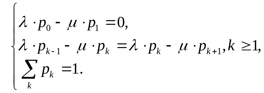 Будем рассматривать системы, удовлетворяющие требованиям: (Р/Е/1):(d/¥/¥). Система может находиться в одном из состояний E0, …, Ek, … Анализ показывает, что через некоторое время такая система начинает работать в стационарном режиме, если интенсивность выходного потока превышает интенсивность входного потока (т.е. коэффициент загрузки системы меньше единицы). Учитывая это условие, получим систему уравнений