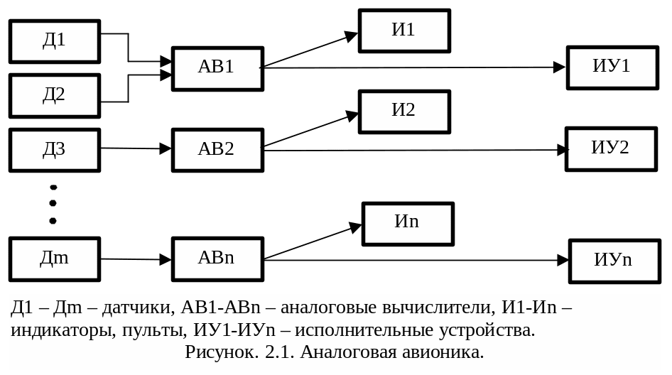 Первое поколение авионики (40-е –50-е годы) - это аналоговая авионика с отдельными и, в основном, независимыми функциональными подсистемами на базе аналоговых вычислителей (рисунок 2.1). Каждая из подсистем имела свои датчики, исполнительные устройства и индикаторы. Связи между подсистемами (если таковые использовались), были реализованы по типу соединений “точка – точка”. Вычислительная система как таковая отсутствовала, комплексная обработка информации не обеспечивалась.