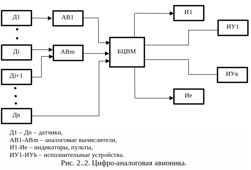 Цифро-аналоговая авионика (начало 60-х - середина 70-х годов) характеризуется использованием в составе бортового оборудования самолетов цифровых вычислительных машин (БЦВМ). По мере совершенствования характеристик БЦВМ (повышения вычислительного потенциала и надежности, снижения веса и энергопотребления) они практически вытеснили аналоговые вычислители. При построении БВС, наряду с каналами передачи аналоговых данных, началось использование радиальных каналов для передачи последовательных цифровых кодов. Эти каналы были организованы в соответствии с требованиями стандарта Arinc 429. Структура гипотетической БВС, авионики второго поколения, приведенная на рисунке.2.2.