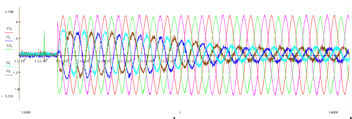 Рисунок 2 – Осцилограми струмів та напруг неробочого ходу АД