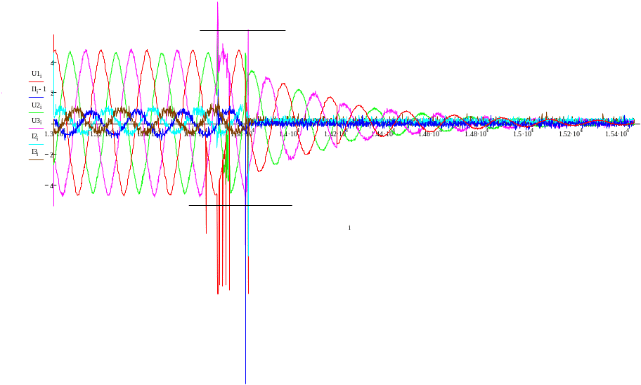Рисунок 4 – Обвідні струмів і напруг статора при пуску АД