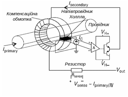 На рис 2.2 схематично представлений датчик струму на основі ефекту Холла – замкнутого типу відповідно, де Iprimary – струм у первинному ланцюзі, Isecondary – струм у вторинному ланцюзі, Vout – вихідна напруга підсилювача, пропорційна струму в первинному ланцюзі. Датчики замкнутого типу (з компенсуючою обмоткою) забезпечують високу точність, у кілька разів більш широку смугу пропущення і не мають вихідного зсуву при нульовому струмі. Їхня чутливість прямо пропорційна числу витків компенсаційної обмотки.