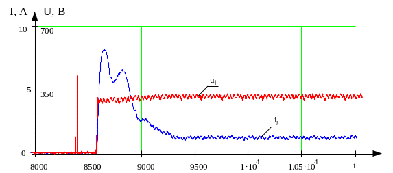 Рисунок 3.6 – Обвідні струмів і напруг статора при прямому пуску АД