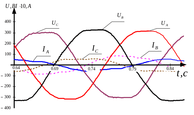 Рисунок 3.5 – Напруги та струми фаз статора АД