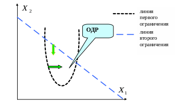 Если оптимальное решение задачи линейного программирования всегда находится на границе ОДР (по крайней мере, в одной из ее крайних точек), то точка оптимума задачи нелинейного программирования может принадлежать либо внутренней части ОДР, либо ее границе.