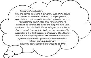 So, how to deal with unfamiliar words? First of all, some unknown words can be ignored because they do not impede our understanding of the information contained in the text that is relevant to our reading purpose. Secondly, there is quite a number of strategies which can help you guess the approximate meaning of a word you don’t know. The most common strategies are: