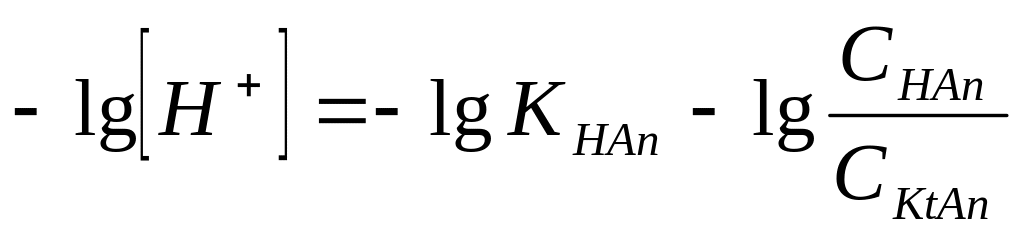 Концентрация ионов водорода в растворах, представляющих собой смесь слабой кислоты и ее соли, зависит не только от концентрации самой кислоты и величины ее константы ионизация, но и от концентрации ее соли. Чем больше концентрация соли, тем меньше [H+] в таких растворах. Причем концентрация ионов водорода в таких смесях зависит не от абсолютных количеств, а от соотношения концентраций компонентов. Логарифмируя выражение (III. 1) и изменив знаки на противоположные, запишем: