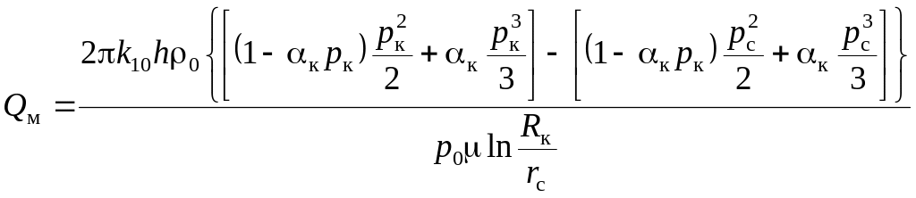 Приймаючи в рівнянні (16.58) р = рк і р = рс, відповідно знаходимо Рк і Рс та, підставляючи їх у формулу масового дебіту свердловини (16.35), одержуємо формулу масового дебіту ідеального газу