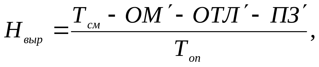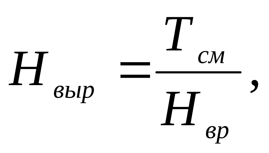 Нормы выработки выражаются в натуральных единицах (штуках, тоннах и т. д.). Она используется в тех случаях, когда в течение смены выполняется одна и та же регулярно повторяющаяся работа. Общий вид расчета нормы выработки следующий: