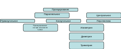 а) прямоугольная изометрическая проекция, б) прямоугольная диметрическая проекция, в) косоугольная фронтальная изометрическая проекция, г) косоугольная фронтальная диметрическая проекция, д) косоугольная горизонтальная изометрическая проекция (триметрия).