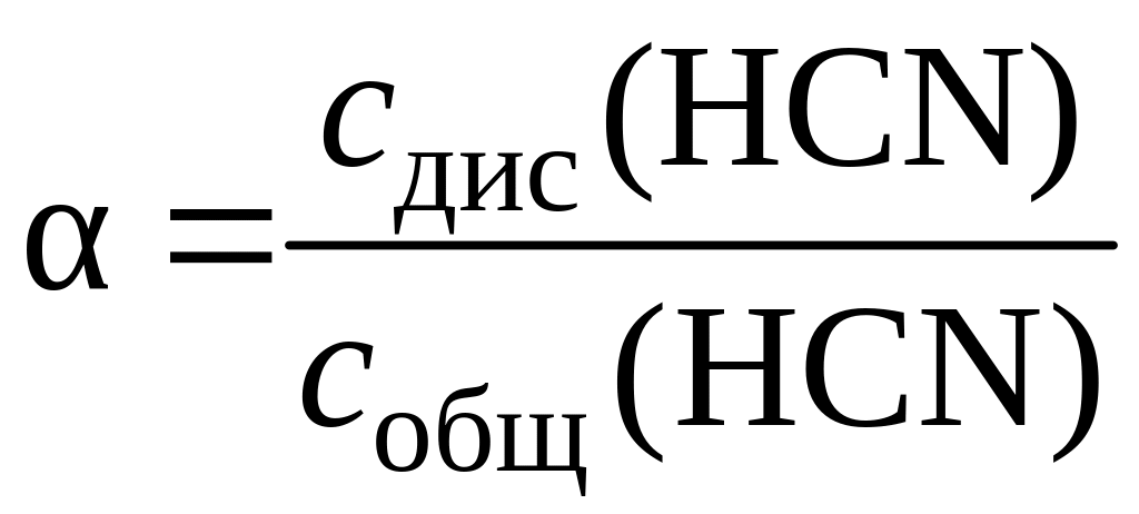 Из уравнения диссоциации указанной кислоты следует, что сдис(HСN) = с(Н+) = с(СN–). Поэтому выражение степени диссоциации можно записать так: