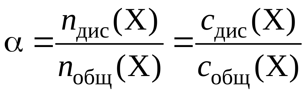 Степенью диссоциации α электролита Х называется доля его молекул, подвергшихся диссоциации, т. е. α – величина, равная отношению числа молекул, продиссоциировавших на ионы, Nдис(Х), к общему числу молекул, введенных в раствор, Nобщ(Х):