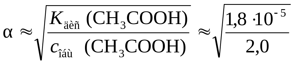 Пример 1.6.2. Чему равна степень электролитической диссоциации уксусной кислоты в растворе, если ее молярная концентрация составляет 2,0 моль/дм3? Какова концентрация ионов Н+ в этом растворе? Kдис(CH3COOH) = 1,8 ∙ 10–5.