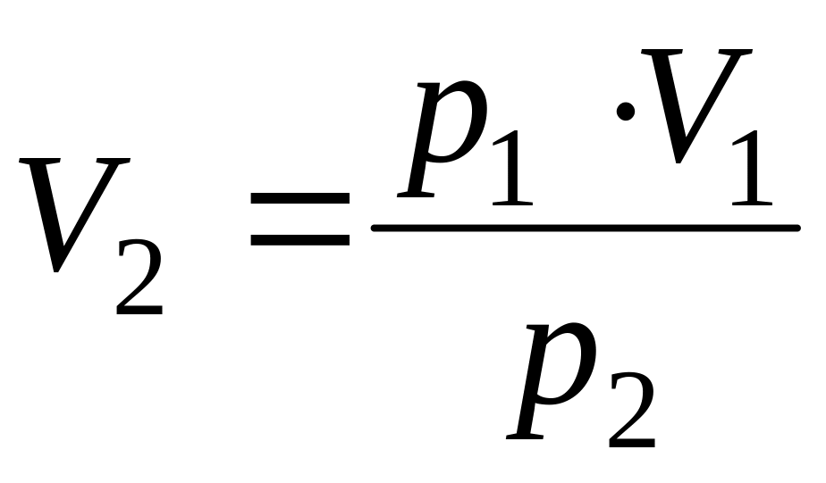 При решении задач закон Бойля – Мариотта используется для расчета объема газа V2 при давлении р2, если известен объем газа V1 при давлении р1: