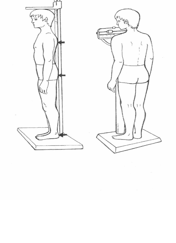 Рост измеряется в положении стоя. При измерении роста ребенок становится спиной к вертикальной стойке, касаясь ее пятками, ягодицами и межлопаточной областью, выпрямив грудь и поджав живот. При этом пятки расположены вместе, а носки врозь. Голова держится ровно, так, чтобы угол глаза и уха находился на одном уровне (рис.1).