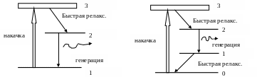В четырехуровневом лазере атомы также перекачиваются с основного уровня (нулевой на рис.) на уровень 3. Если после этого атомы быстро переходят на уровень 2 , то между уровнями 2 и 1 может быть получена инверсия населенностей. Когда в таком четырехуровневом лазере возникнет генерация, атомы в процессе вынужденного излучения переходят с уровня 2 на уровень 1. Поэтому для непрерывной работы четырехуровневого лазера необходимо, чтобы частицы с уровня 1 очень быстро переходили на нулевой уровень.