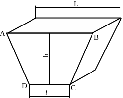 Задача 3.3.1. Определить силу давления на вертикальную стенку ABCD сосуда, полностью заполненного водой (рисунок 3.9), и положение центра давления, если L = 32 м; l = 26 м; h = 18 м; ρ = 103 кг/м3; g = 10 м/с2.