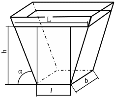 Задача 3.3.2. Определить силы давления жидкости на стенки и основание открытого сосуда, если l =5м;b = 3м; ρ = 1000 кг/м3; h=2 м; α = 60°; g = 103 м/с2 (рисунок 3.10).