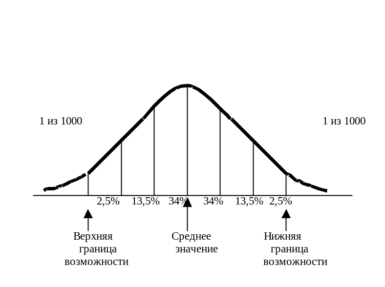 Кривая нормального распределения строится по следующим правилам: 1) производятся измерения на выходе процесса, 2) правильное нормальное распределение всегда симметрично, 3) по 50% результатов измерений располагаются с каждой стороны от среднего значения, 4) с каждой стороны от среднего приблизительно 16% значений оказываются за пределами 1, 2,5 % - за пределами 2, 0,1% - за пределами 3 от среднего значения.