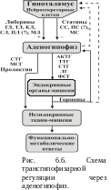Трансгипофизарная регуляция через аденогипофиз осуществляется с помощью нейронов гипоталамуса, гормоны которых регулируют образование гормонов аденогипофиза, тропных к периферическим железам (рис. 6.6).