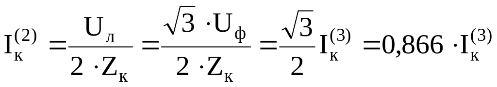– при двухфазном КЗ поврежденная цепь питается линейным напряжением Uл, а полное сопротивление цепи состоит из последовательно включенных сопротивлений Zк двух фаз: