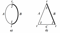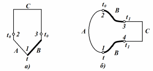 Выясним, как влияет на значение термоЭДС термоэлектрического термометра третий проводник, включенный в его цепь. Для этой цели рассмотрим термоэлектрический термометр, состоящий из термоэлектродов А и В, в цепь которого включен проводник С (рисунок 2, а). При этом температура спая 1 равна t, а температура мест соединения (2 и 3) равна t0. Определим термоЭДС Е для этой цепи. В соответствии с принятыми условиями