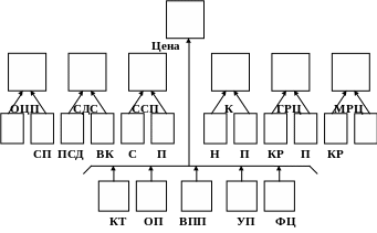 ОЦП - общественная цена производства; ОИП - общественные издержки производства; СП - средняя прибыль; СДС - состояние денежной сферы; ПСД - покупательная способность денег; ССП - соотношение спроса и предложения; С - спрос; П - предложение; К - конкуренция; Ц - ценовая; Н -неценовая конкуренция; ГРЦ - государственное регулирование цен; П - прямое (административное) регулирование; КР - косвенное (экономическое) регулирование; КТ - качество товара; ОП - объем поставок; ВПП - взаимоотношение между продавцом и покупателем; УП - условия поставок; ВПП - взаимоотношения между продавцом и покупателем; УП - условия поставок; ФЦ - франкирование цены.